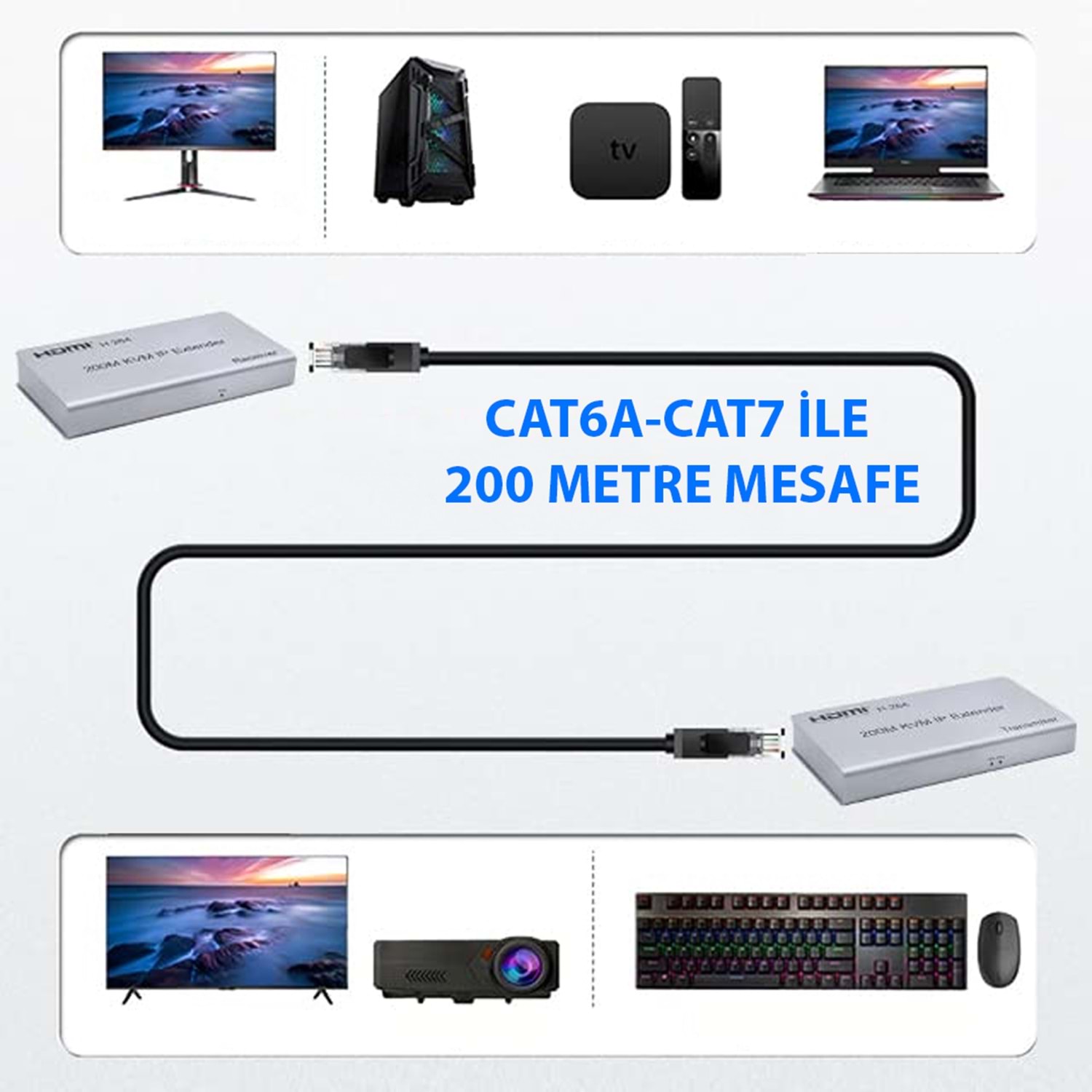 İletim Mesafesi: CAT6/CAT7 kablo ile 120 metreye kadar sinyal iletimi.