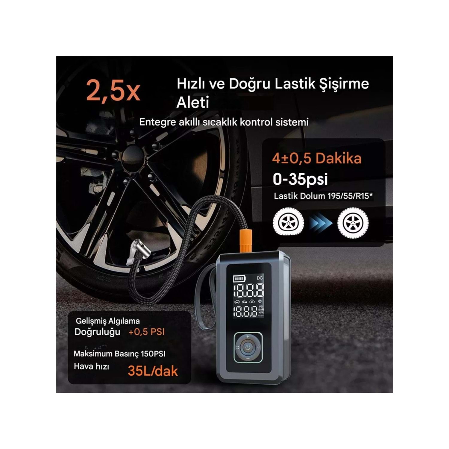 Taşınabilir Tasarım: Bu kompresör kompakt ve hafiftir, taşınması kolaydır ve fazla yer kaplamaz, bu da onu arabanızda her zaman bulundurmanız gereken pratik bir araç haline getirir.