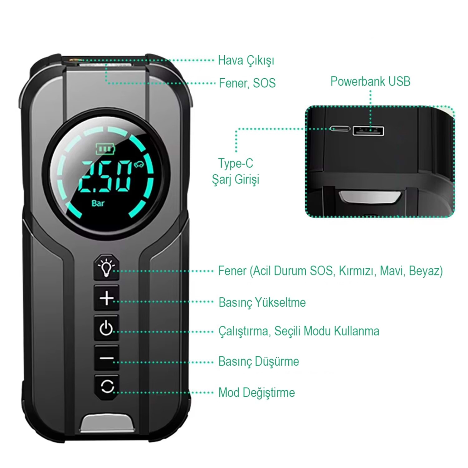 PowerMaster PM-25006 Powerbank Araç Akü Şarj Lastik Hava Kompresörü Şişirici Taşınabilir Dijital Kablosuz El Feneri Özellikleri