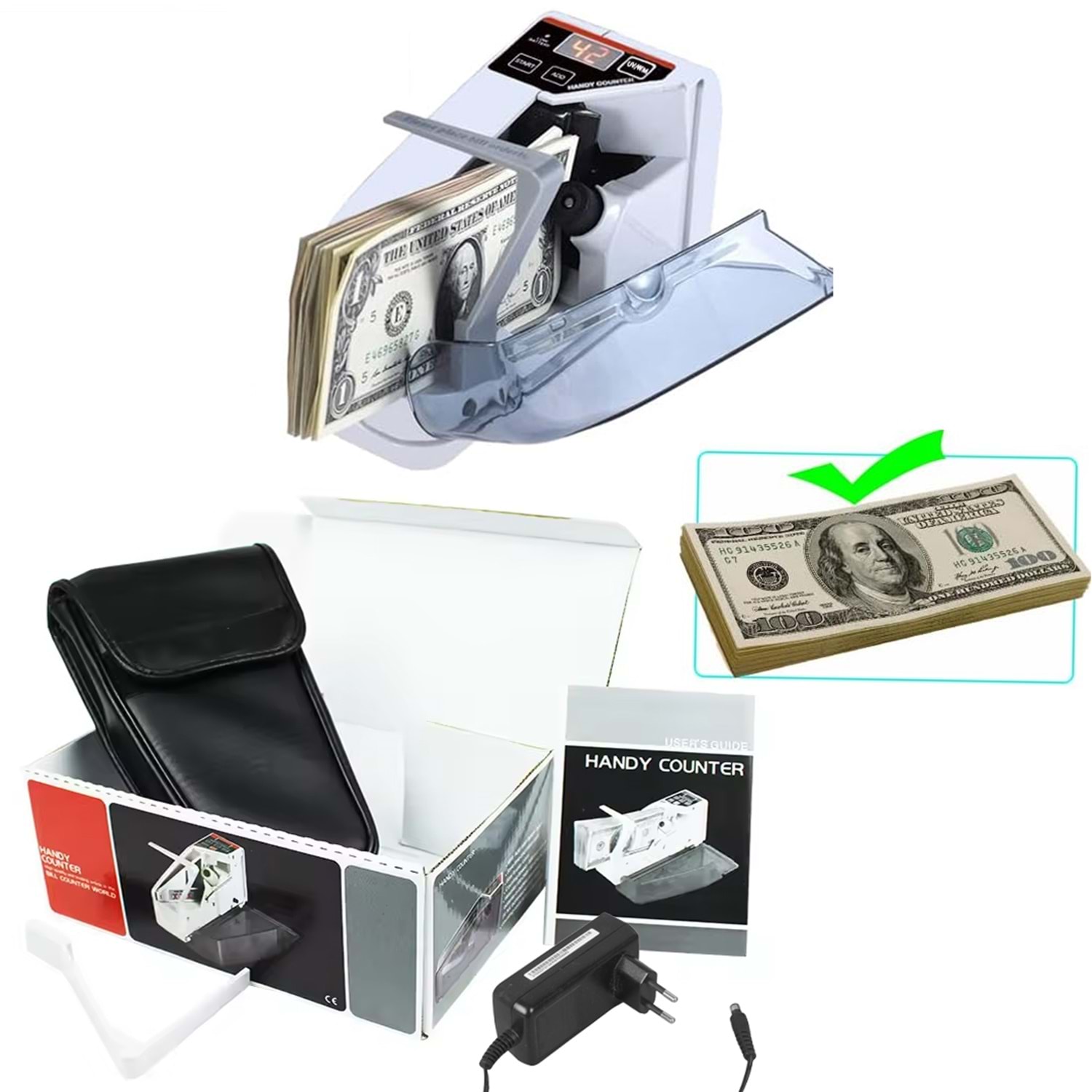 Powermaster PM-27184 Taşınabilir DC 5V Mini Uv Işık Para Kontrol ve Sayma Makinesi; banknotların sayısını hızlı ve doğru bir şekilde sayar. Cihaz sadece aynı cinsdeki banknot sayısını adet olarak sayar, paraları tanımaz. Dakikada 600 adet sayma kapasitesine sahiptir. Şüphelendiğiniz kağıt parayı cihazın arkasındaki para kontrolü için bulunan UV ışık ile kontrol edebilirsiniz. Kompakt boyut, kolay taşınabilirlik sağlar. Zarif deri çantası ile istediğiniz zaman, istediğiniz yerde rahatça kullanabilirsiniz.